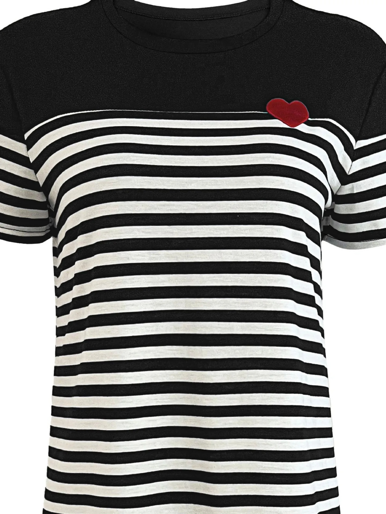 - Style moderne et féminin : rayures horizontales tendance et empiècement noir contrasté avec un petit cœur brodé rouge pour un charme unique.